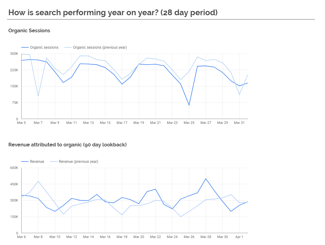 - “Our organic sessions have dropped”: This could easily be because of seasonality. We always see a drop in the summer holidays. *Okay, also not a good metric.