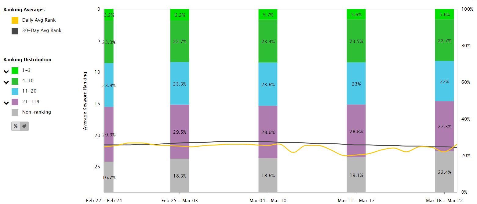 Conclusion: Yes, we should include keyword rankings, but they need to be grouped and ideally also have both rank with and without Google features. We’ll also want to avoid averaging rank, to lose subtlety in how our keywords are moving amongst each other. This example graph from STAT illustrates this well: