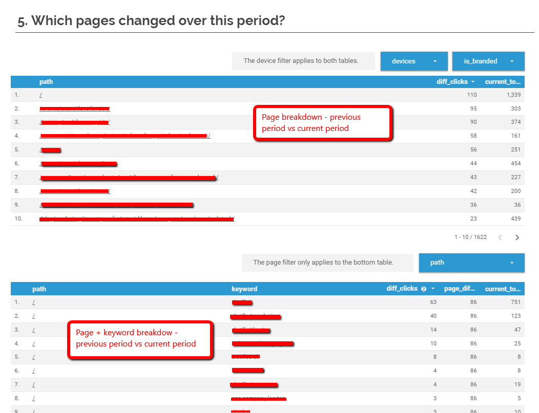 Here’s an example from an internal report I made. It shows the page breakdown first and then the page keyword breakdown after it to let you dig deeper.