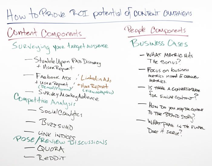 These are all the content and metric components of this. But what you really need to focus on, when you're trying to get buy-in for this type of content internally, is the people components. When you're building business cases and you're dealing with a variety of people, your boss in fact, you've got to think about what metric is the one that helps him get to his bonus, and how does the content that you're looking to create help fulfill that metric.