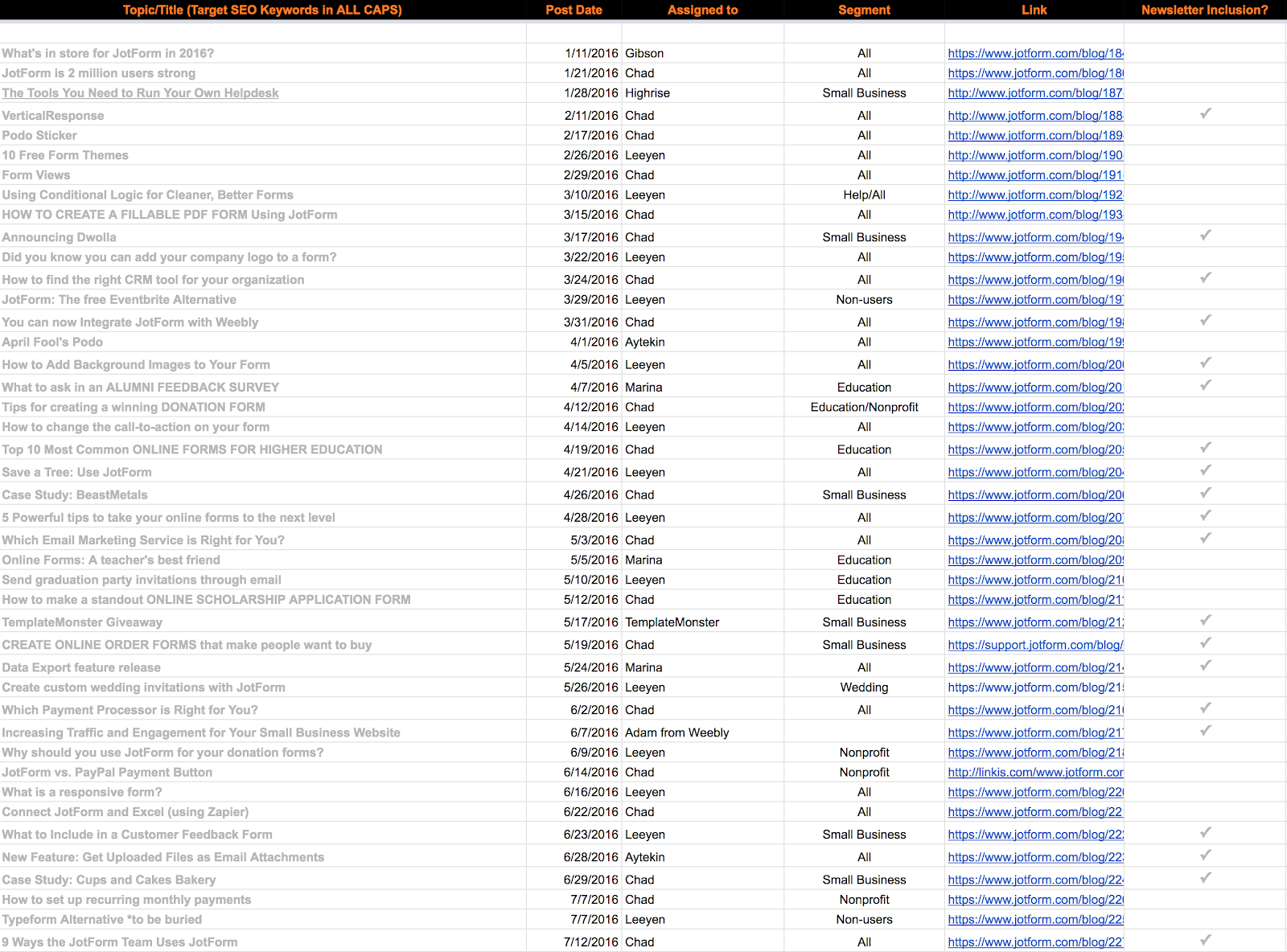 Our old editorial calendar was a Google sheet. I started it back when JotForm was publishing one or two blogs per week and needed a way to keep it organized. It worked.