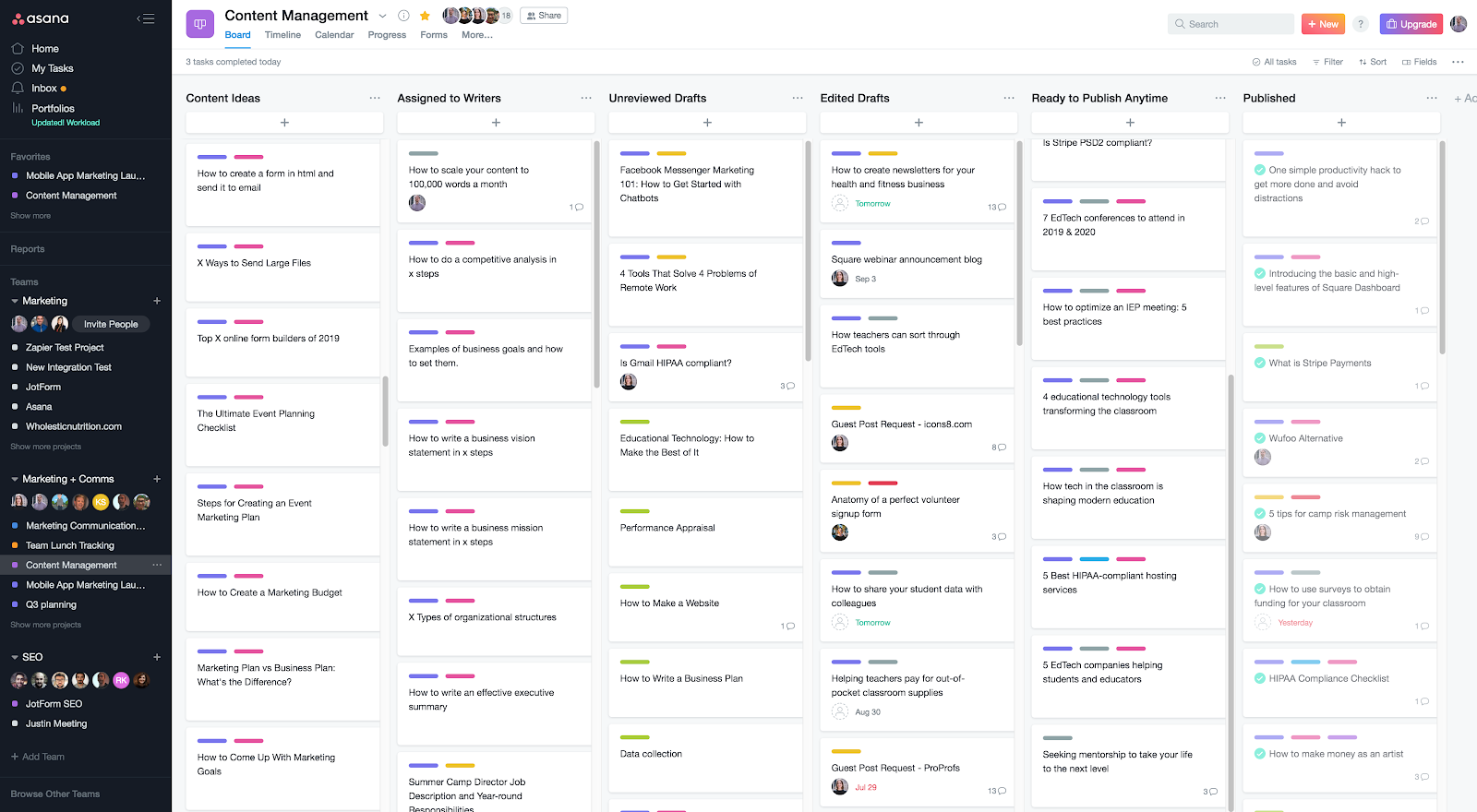 After much discussion, we migrated our editorial workflow into Asana, which seemed like the closest thing to what we needed. It has a nice calendar view, the tagging functionality helped keep things orderly, and the board view gives a great overview of everyone’s projects.