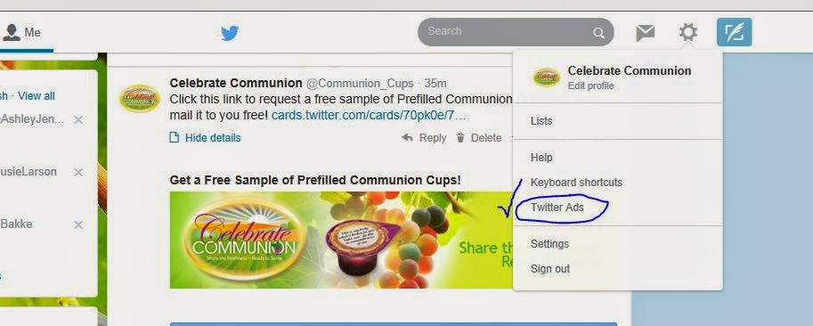 - Click the Setting Icon and select "Twitter Ads" from the drop down menu [Screenshot below]