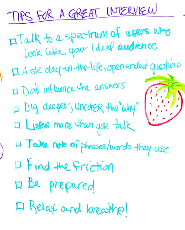 So the first one is to talk to a spectrum of users who represent your ideal audience. Maybe, like with this berry example, their ideal customer tends to skew slightly female. You would want that group of people, that you're talking to, to skew that way too. Perhaps they have a little more disposable income. That should be reflected in the group of people that you're interviewing and so forth. You get it.