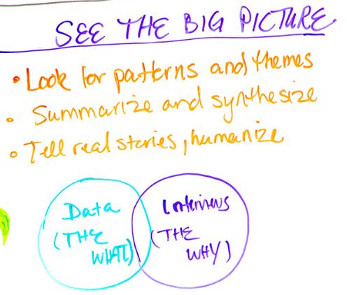 So once you've kind of finished and you've wrapped up those interviews, take a step back. Don't get too focused or caught up on just one of the results. You want to kind of look at the data in aggregate, the qualitative data and let it talk to you.
