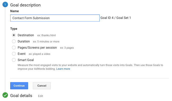 - Give your goal a name (ex. Contact Form Submission) and choose a type. Most goals for local businesses will either be a Destination or an Event.