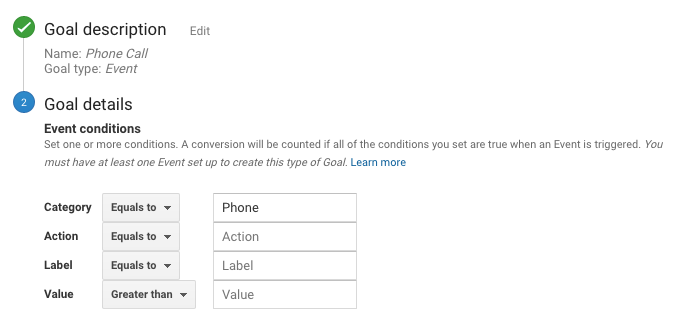 To get your calls recorded in Analytics, you’ll just need to enable that option from your call tracking service. With CallRail you simply enable the integration, add your domain, and calls will be sent to your Analytics account as Events. Just like with your form submissions, you can add these events as a goal. Usually it makes sense to add a single goal called “Phone Calls” and set your event conditions according to the output from your call tracking service. If you’re using CallRail, it will look like this: