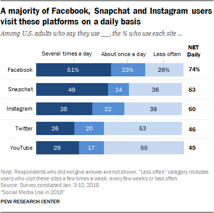 I shouldn’t have to convince you that investing in a social media for your company is worth it; even in light of Facebook’s recent data breach, we are so reliant upon our social profiles for real human interaction that leaving them is not a real option. In fact, the below statistics from Pew Research Center’s 2018 Social Media Use Survey indicate that we’re not going to give up our social media profiles any time soon.