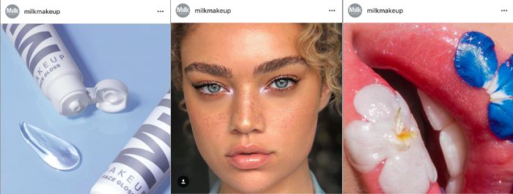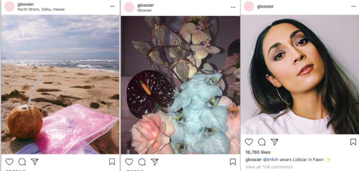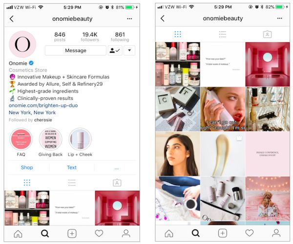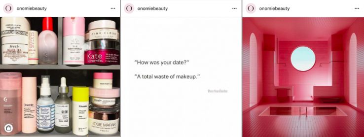 Color schemes remain consistent across Onomie’s, Milk’s, and Glossier’s photos — these beauty brands don’t suddenly change their color palettes from one photo to the next. In fact, they are most likely implementing the same Instagram filters for each photo, or at least editing the color balances so that the photos complement each other. They are deliberately catering to Instagram’s 3x3 grid photo format (or 3x4, or 3x5, depending on your screen size). While many users do see IG posts in their “feeds” when they open the app, users are still motivated to look at IG accounts’ for a number of reasons: IG profiles are the only place where you can add hyperlinks on Instagram, and is also where accounts can pin stories for users to revisit.