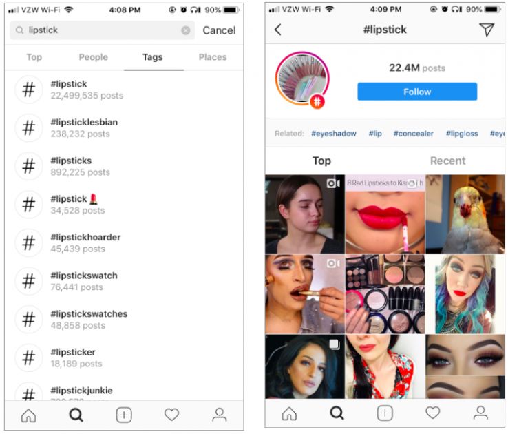 Just like on Twitter (and Facebook, to a degree), hashtags are a natural way to boost exposure and get “discovered.” That’s largely because IG users can also follow hashtags, in the same manner as following a handle. And, just like on Twitter, it matters which hashtags you use. IG also allows users to add up to 30 hashtags per post — and yes, this can look spammy, but if you’re using IG like a beauty brand, you’ll separate your caption from your hashtags with periods-used-as-line-breaks or as a separate comment after you post.