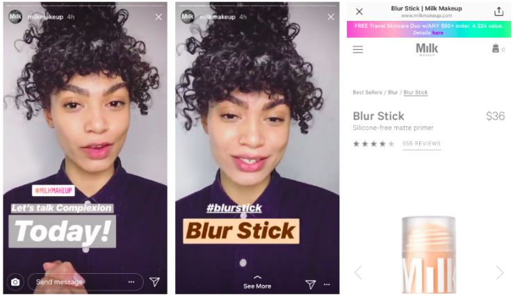 IG’s “Stories” feature is another great tool that Onomie, Milk, and Glossier all use. They’re like IG posts, but ephemeral (they only last 24 hours) and do not live in your main feed: users can access these stories from the top of their IG feeds, and from the account’s main icon. In some cases — especially brands selling products — these accounts may choose to “pin” evergreen stories to their IG profiles, so that users can access them beyond the 24-hour lifespan.
