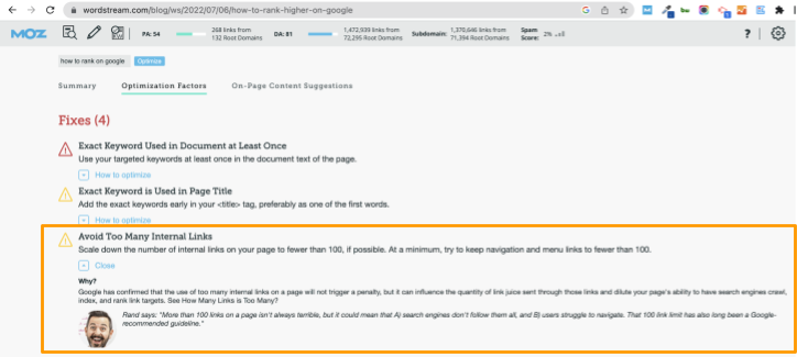 If you’re unsure whether or not you’ve got too many internal links on the page, you can run it through Moz’s On-Page Grader tool, which automatically counts the number of links on your page and flags if you’ve got too many.