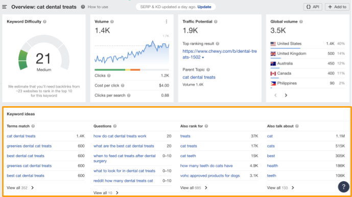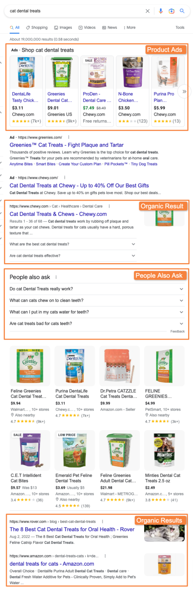 Let’s say you’re a pet food company and one of your main products is cat dental treats. Once you’ve determined that this is the exact keyword you want to target (“cat dental treats”), it’s time to start your research.