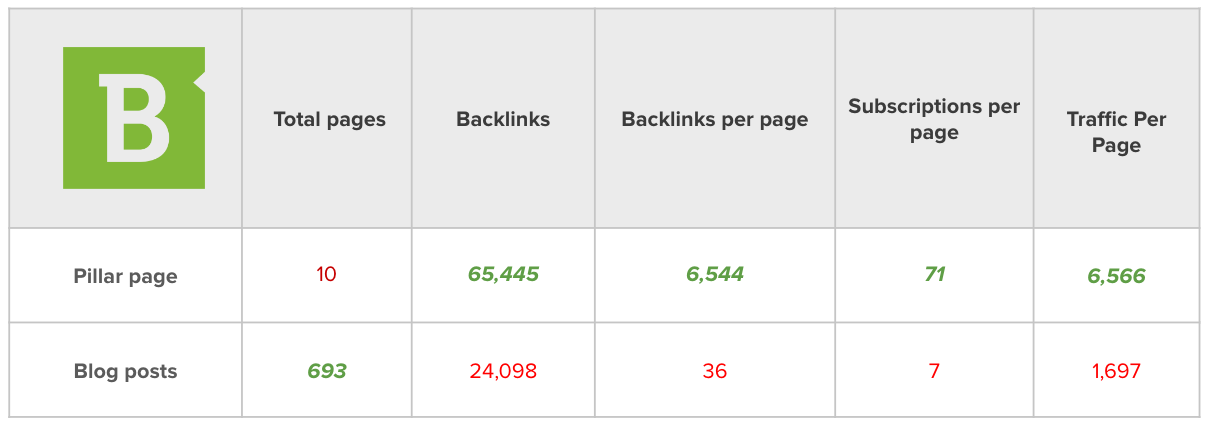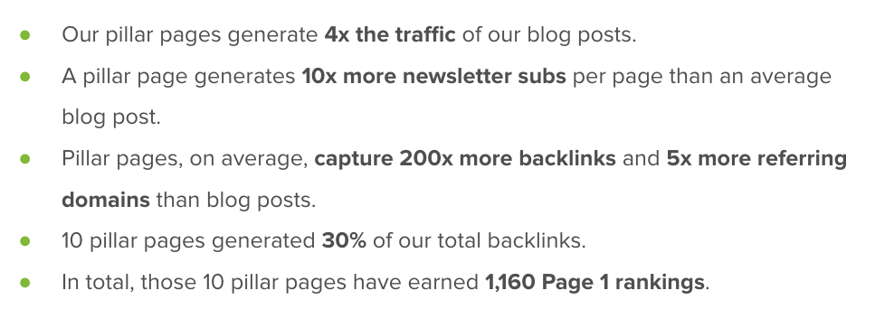 In a recent study, we found that our pillar pages are magnets for links, organic traffic, and newsletter subscribers — especially compared to regular blog posts. Here are the results that both types of SEO content generated over the course of a year: