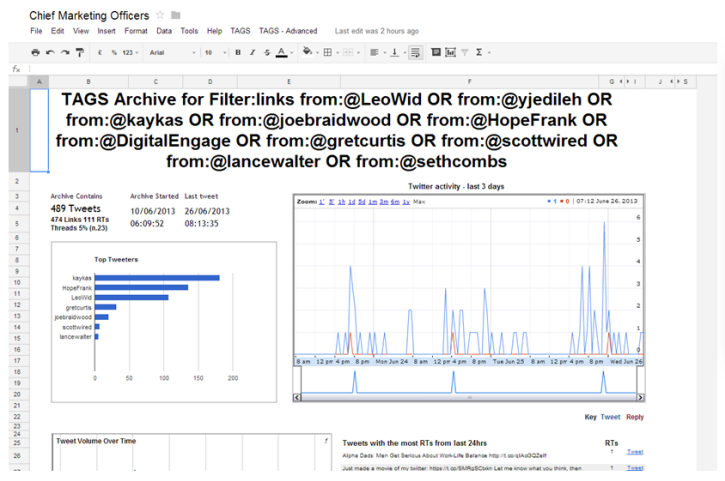 About eight weeks ago, Geoff introduced me to TAGS – a really clever Google Spreadsheet that archives Twitter data. It's really brilliant at collecting Twitter advanced search data and storing it in a spreadsheet. The best bit: It can update hourly. It's created by Martin Hawksey — a bit of a star in my opinion (thanks for the spreadsheet, Martin!). Here it is: