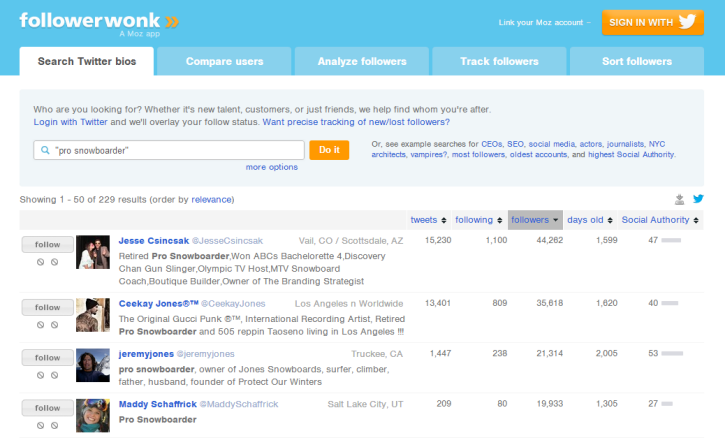 Imagine you're interested in Tweets containing URLs from Pro Snowboarders. Where would you go to find influential Pro Snowboarders on Twitter? Followerwonk, of course! Take a look: