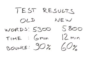 After implementing the compressed version of my original article, giving them a choice of what they will read and when, I expanded the average time on page to 12 minutes, which is extraordinary. My bounce rate was reduced to 60%, which meant that people kept browsing for more of my content.