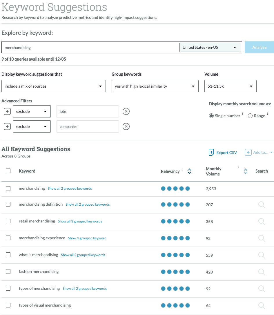 So I type “merchandising” into Keyword Explorer, add a couple more helpful filters, and boom! Tons of keyword suggestions.