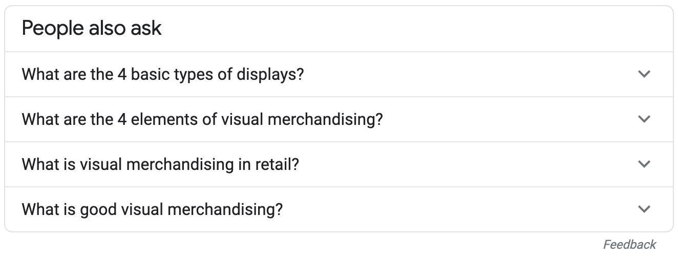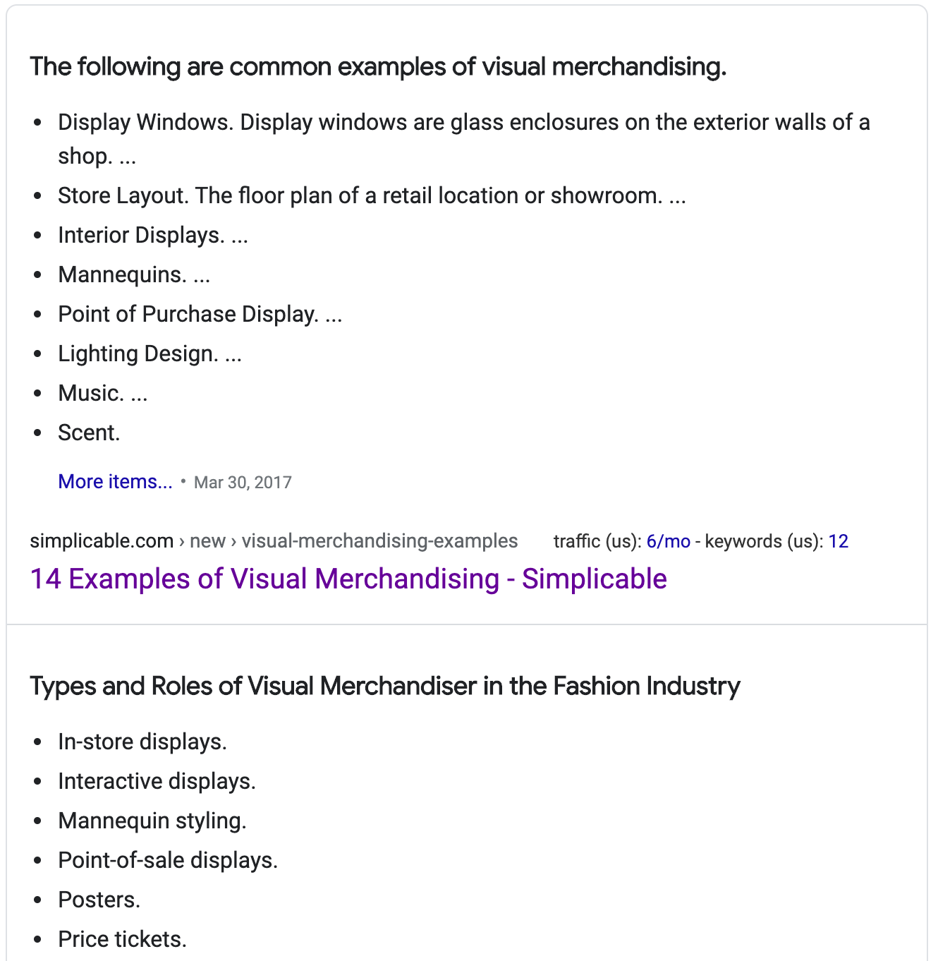To use the same keyword example, if I Google “types of visual merchandising,” the top-ranking articles contain lists.