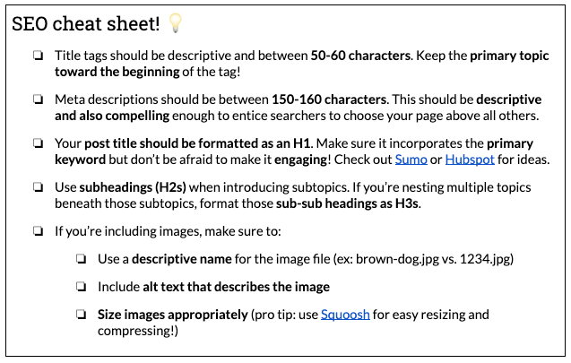 One thing I always like to include in my briefs is some form of an “SEO cheat sheet” — tips and resources for helping your writers with important on-page SEO elements.