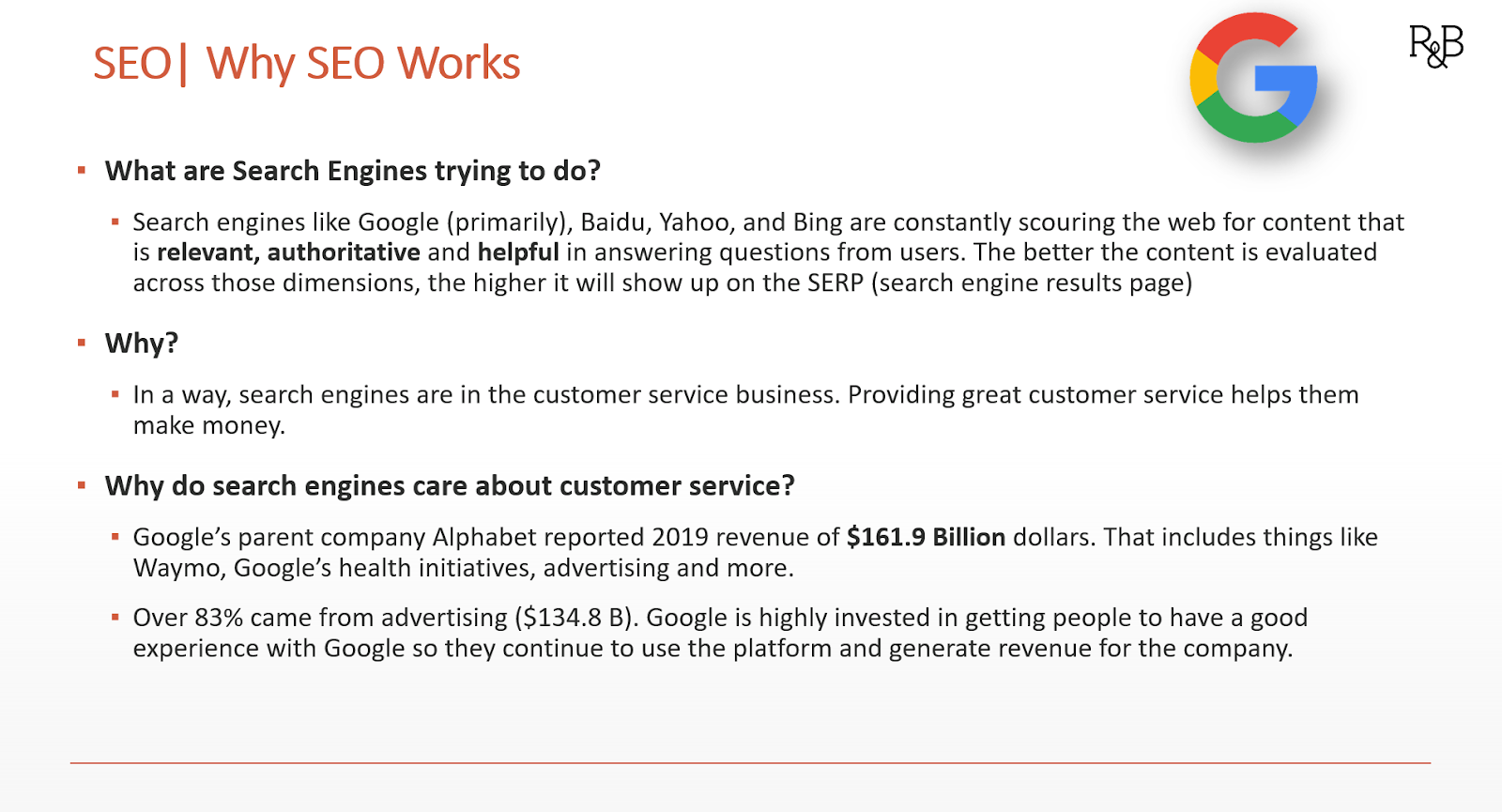 Search engines like Google are looking for Expertise, Authoritativeness, and Trustworthiness (E-A-T) in content to rank highly on the SERP. In addition to making good local sense for Google, it all comes back to the core of Alphabet’s business model, as the slide below shows.