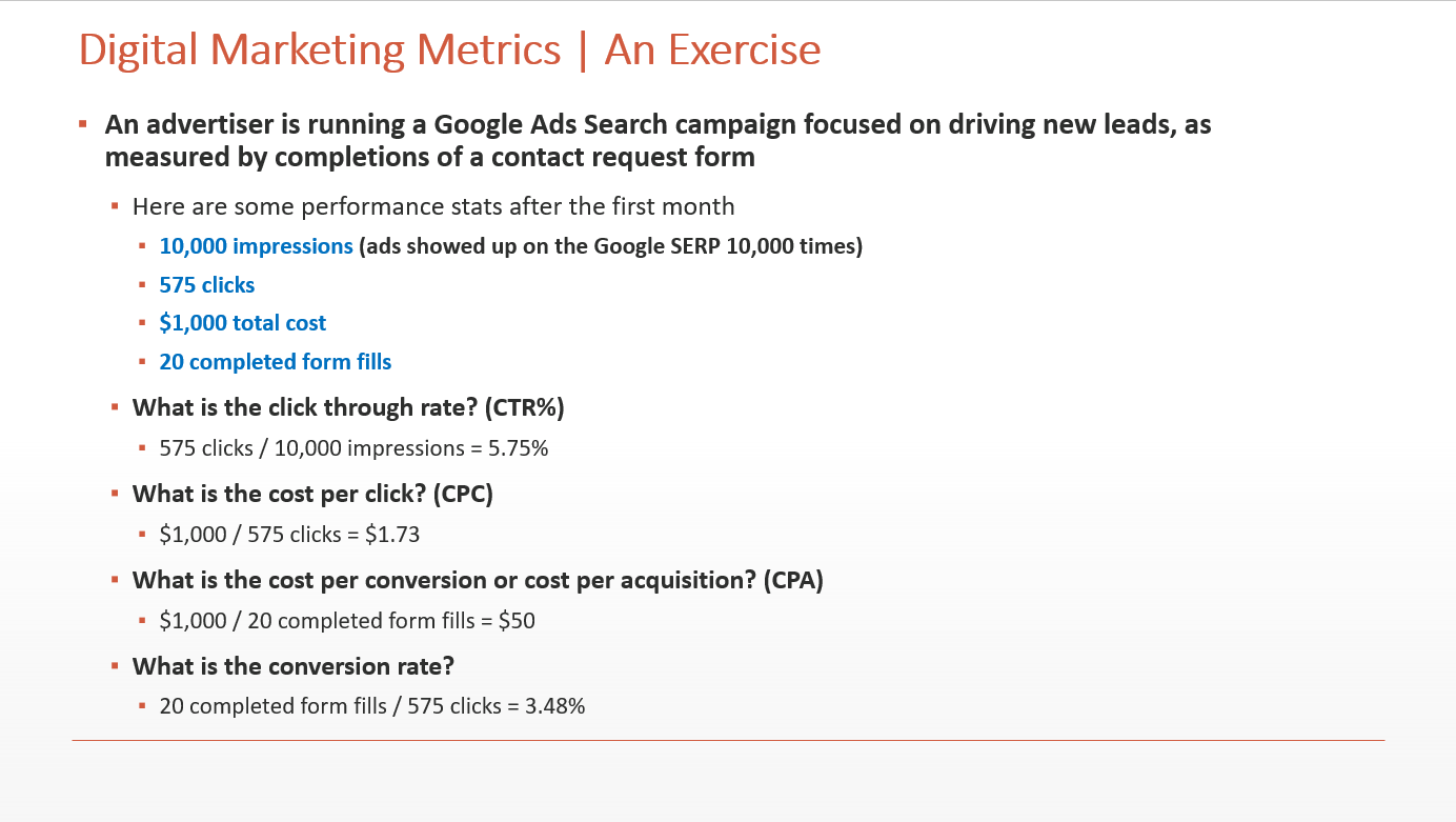 There are some universal metrics that we all need to understand if we’re going to develop a competency in digital marketing. Click through rate (CTR), for example, is a great way to measure how effective an ad unit or organic result is in terms of generating a click.