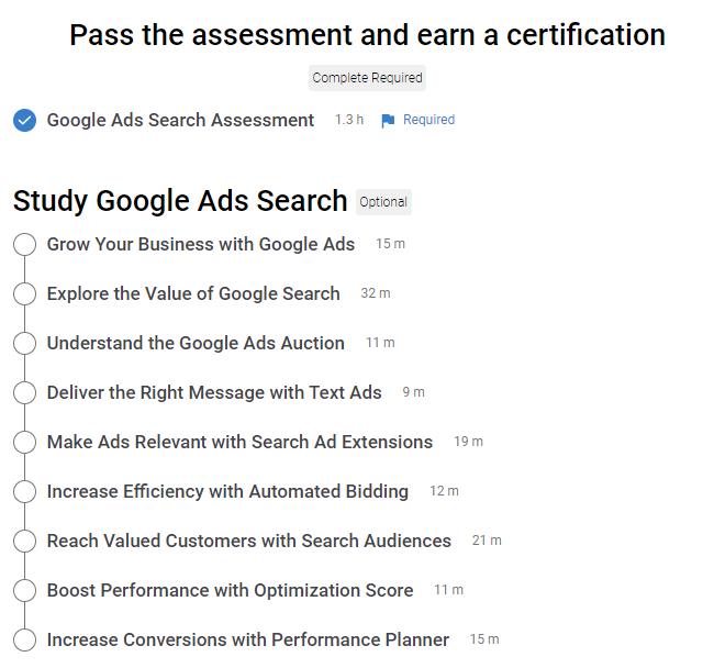 If you’re already a Google Ads pro, you can hop right to the exam and take the timed Google Ads Search Assessment. If you can get an 80% or higher on the 50-question exam, you’ll get a certification badge!