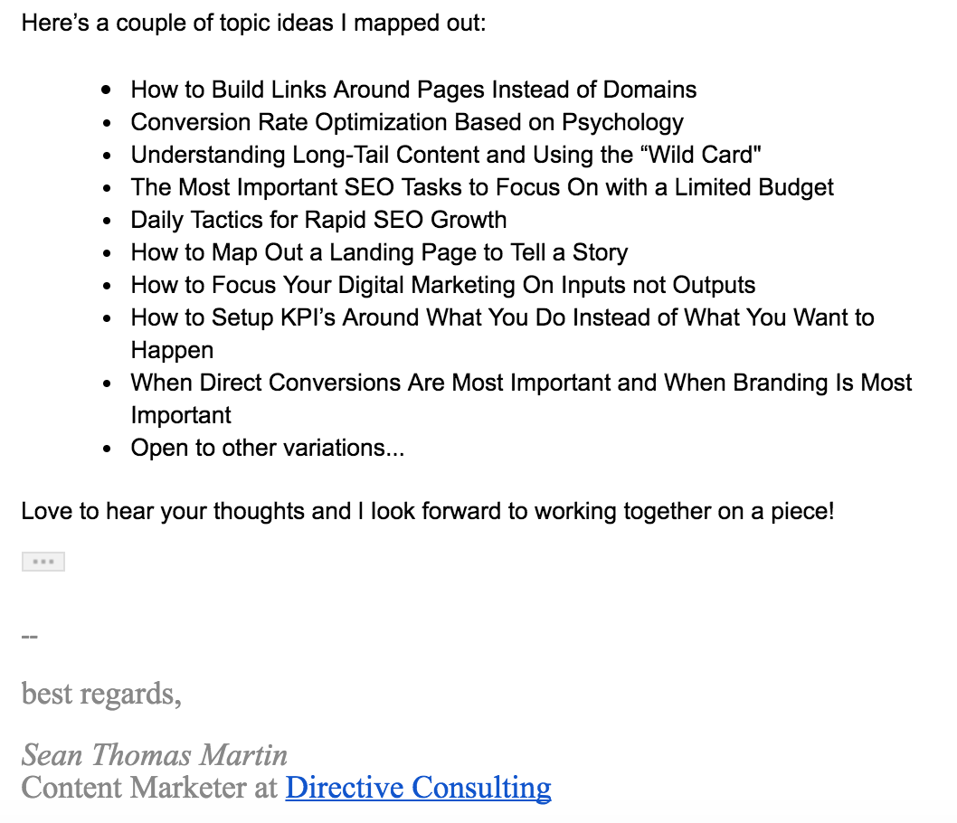 Each list was targeted to a different niche industry where we wanted to guest post. Each list had 10 unique topics all specified to that blog's niche.