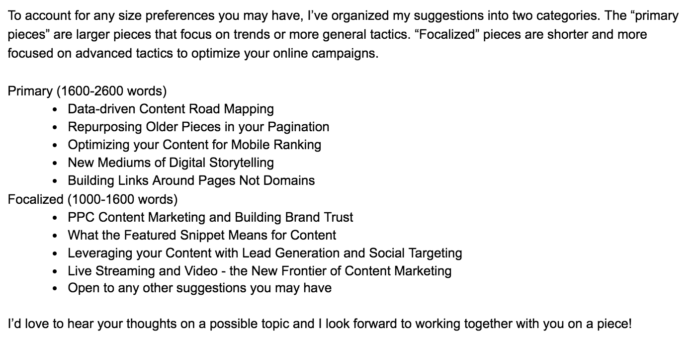 In our email copy, we emphasized our flexibility to the editor's timeline/content calendar. We also provided a "open to any other options you may have" option in our list of topics. But the biggest change to our offer was this: