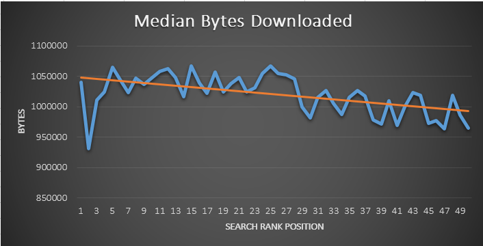 The surprising result here was with the the median size of each web page, in bytes, relative to the search ranking position. By "page size," we mean all of the bytes that were downloaded to fully render the page, including all the images, ads, third party widgets, and fonts. When we graphed the median page size for each search rank position, we found a counterintuitive correlation of decreasing page size to decreasing page rank, with an anomalous dip in the top 3 ranks.