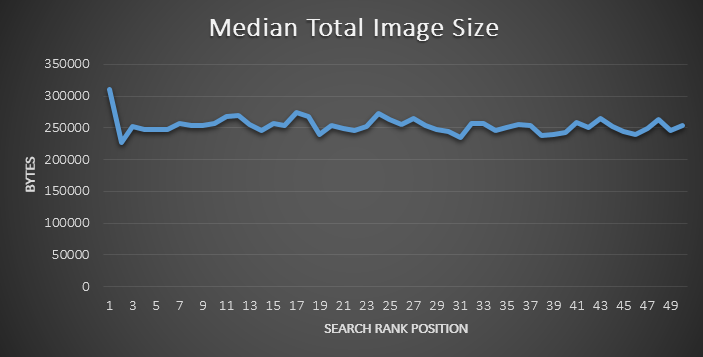 Since our analysis of the total page size surprised us, we decided to examine the median size, in bytes, of all images loaded for each page, relative to the search rank position. Other then a sharp spike in the first two rankings, the results are flat and uninteresting across all remaining rankings.