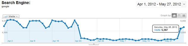 Just as I was about to start manually e-mailing the remaining blogs to remove WPMU links, a great thing happened - recovery. On Friday, May 25th, a clear return from the 1.1 refresh of Penguin occurred, bringing ranking and traffic levels to what look like the same spot they were previously. Given that it's a holiday weekend, traffic is considerably down, so it's hard to tell for certain - but considering what we know about traditional impacts from the holidays, it looks like WPMU has made a full recovery from its original hit from the Penguin update.