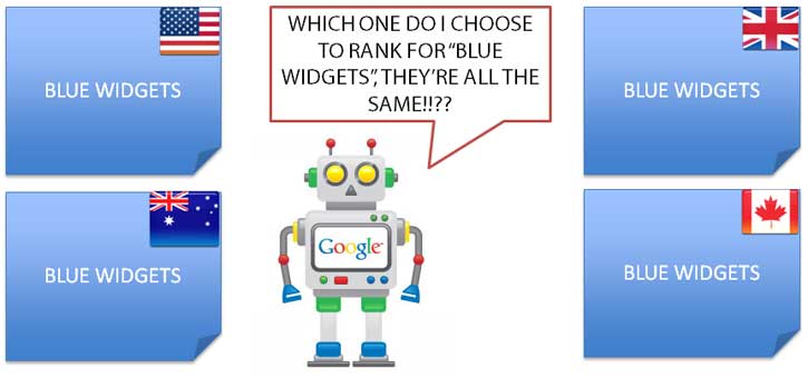 - Fix duplicate content issues: If you have duplicate copies of your pages targeting the same keywords, it does not mean that the right country version will rank because of hreflang. The same rules apply to general SEO; when there are exact or nearly exact duplicates, Google will choose which page to rank. Typically, we see the version with more authority ranking (authority can be determined loosely by #links, TBPR, DA, PA, etc.).