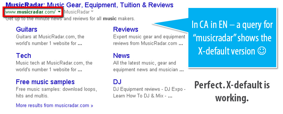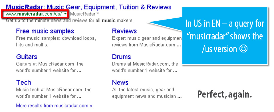 Musicradar.com should appear in GB and all other queries other than EN-US and FR-FR where each respective subfolder should appear.
