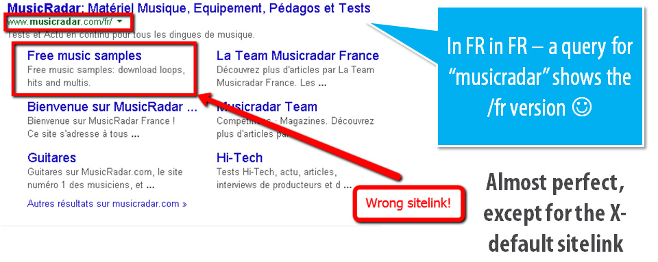 - The English sitelink in the French results is pretty weird, but I think this is the perfect situation to escalate to Google as their implementation is correct as far as I can tell.