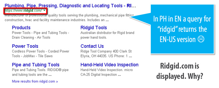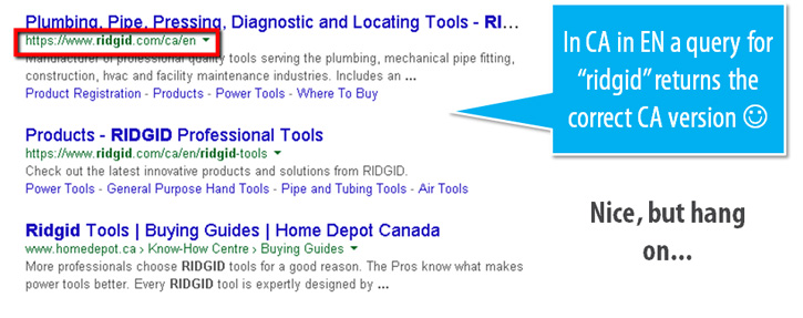- The Canadian version contains <link rel="canonical" href="https://www.ridgid.com/" /> - that means it's being canonicalized to the main US version