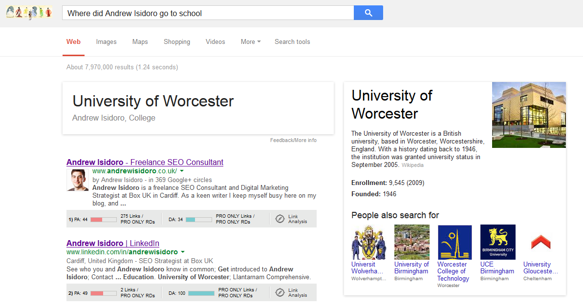 It seems that anyone now wishing to find out "Andrew Isidoro's Age" could now be greeted with not only my age but also my date of birth in an information panel. After a few well-planned boasts to my girlfriend about my new found fame (all of which were dismissed as "slightly sad and geeky"), I began to probe further and found that this was by no means the only piece of information that Google could supply users about me.