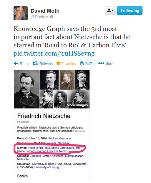 This error can be traced back to a rogue Freebase entry added in December 2012 (almost a year ago) that sat unnoticed until this "update" put it into the public domain. This suggests that some sort of editorial control was relaxed to allow this information to show, and that Freebase can be used as a single source of data.