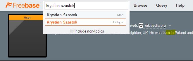 The breakthrough happened in early January - previously when I searched Freebase for 'Krystian Szastok' I only got my entry marked as 'user' - which wasn't similar to Andrew's who had 'Marketer' as his type.