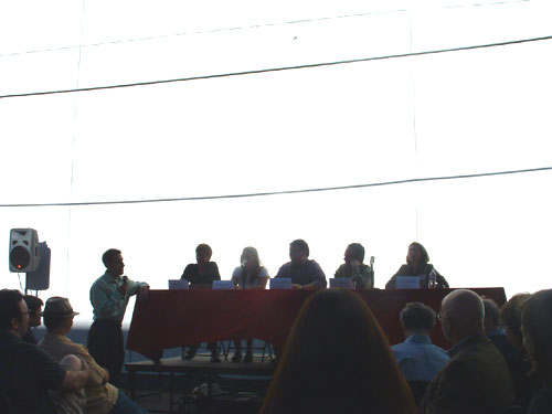 My crappy photo of the panel: John Cook, Tricia Duryee, Michael Arrington, Fred Vogelstein, and Becky Buckman