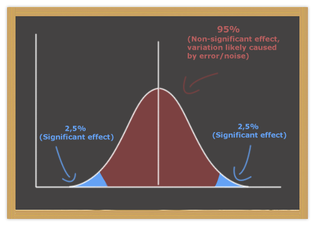 In most experiments and experimental software, 95% confidence is used as the threshold of significance, although this number is somewhat arbitrary. If the difference between two group means is significant at 98% probability, we accept it as significant even though there is a 2% probability that the difference is caused by chance. Thus, statistical tests show us how confident we can be that difference in result are not caused by chance / random error. In Google Website Optimizer, this probability is called chance to beat original.