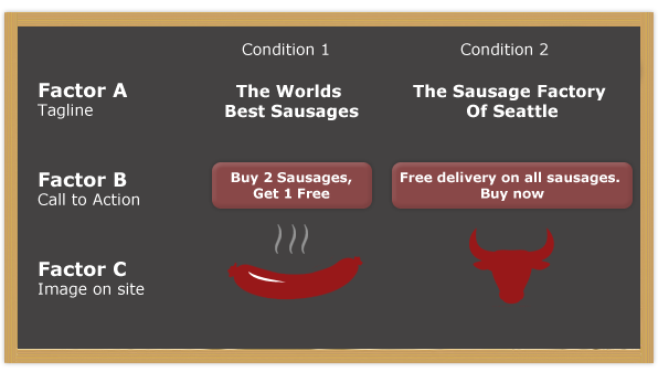 This design is not too bad when we have 3 factors with 2 conditions in each. But if we want to test 4 factors each comprising 4 conditions, we will have 44 = 256 groups. Or if we want to test 10 different factors with 2 conditions in each, we will end up with 210 = 1,024 groups. This will require a lot of subjects to detect any significant effect of the factors. This is not a problem if you are Google or Twitter, but it is if you are selling sausages in the wider Seattle area (You can calculate the test duration time with Google's Calculator and VisualWebsiteOptimizers Calculator. These calculators are, however, based on very imprecise data because the change in conversion rate is unknown. That is kinda the point of the test).