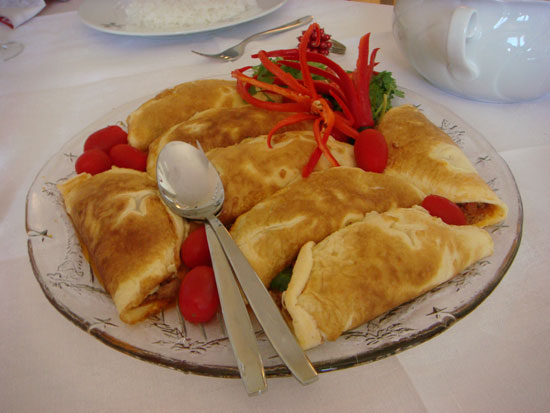 Ridiculously tasty omelet thingies that were filled with spicy-sweet pork and other fixins