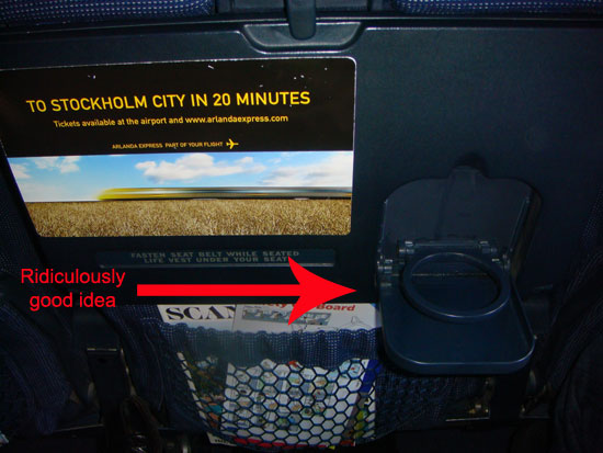SAS has cup holders that fold down from your tray table, allowing you to use the cup holder without