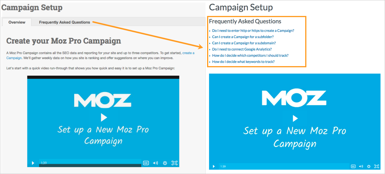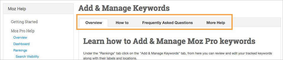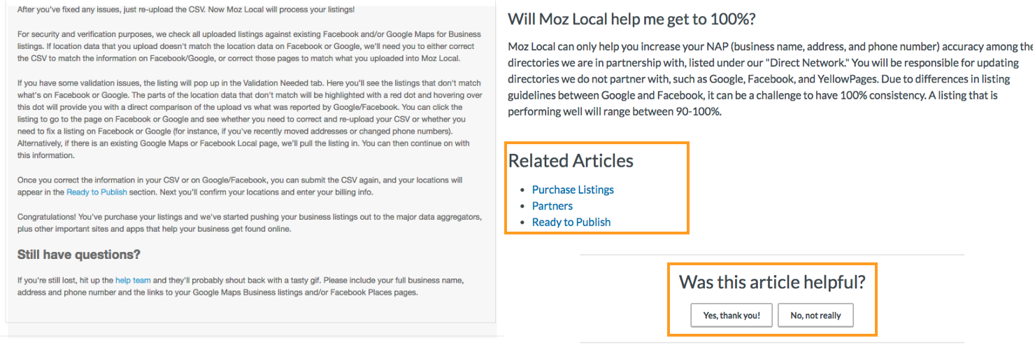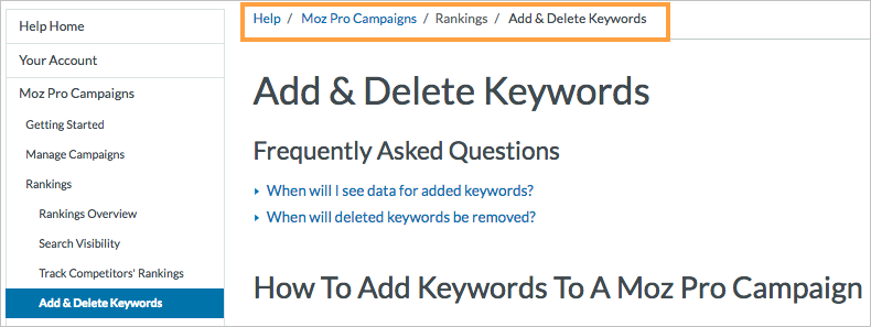 Related Articles help people to continue to self-serve, honing in on more specific guides. I’m not saying that you're going to buckle down and binge-read ALL the Moz help guides — I know it’s not exactly Netflix. But you never know — once you hit a guide on Keyword Lists, you may think to yourself, "Gosh, I also want to know how to port my lists over to my Campaign. Oh, and while I’m here, I’m going to check on my Campaign Settings. And ohh, a guide about setting up Campaigns for subdomains? Don’t mind if I do!" Guide lovers around the world, rejoice!