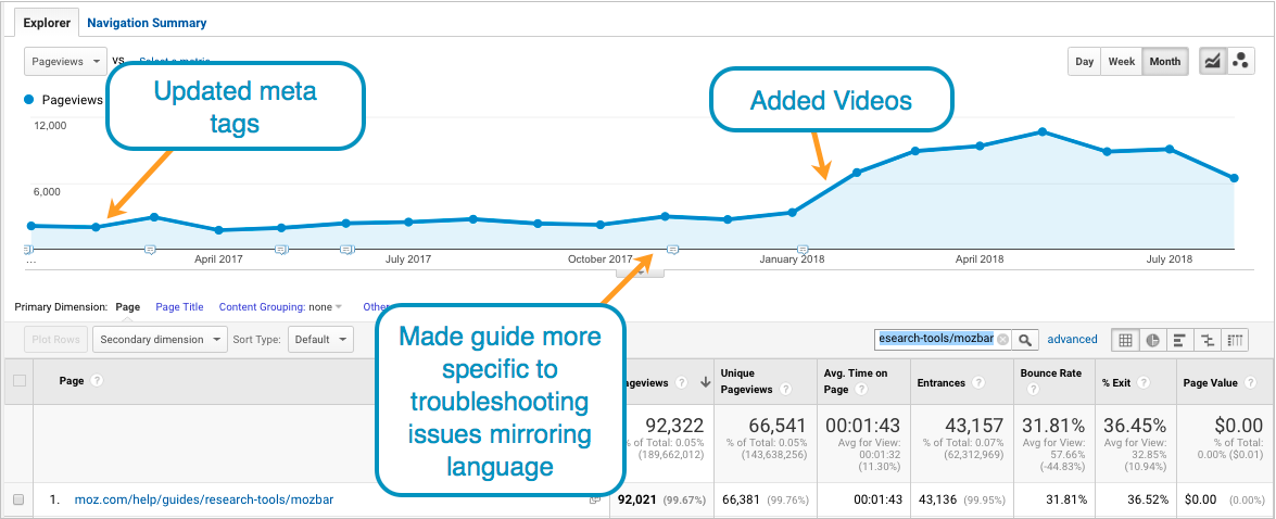Using the MozBar guide as an example, we tried a few different things to improve the CTR over a period of 12 months. We added more content, we updated the meta tags, we added jump links. Around 8 weeks after the guide was made more relevant and specific to searchers' troubleshooting queries, we saw a massive uptick in traffic for that MozBar page, with pageviews increasing from around ~2.5k per month to ~10k between February 2018 and July 2018. Traffic from organic searches doubled.