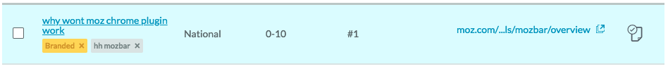 It’s more useful for our customers and our help team for this page to rank for something like "why wont moz chrome plugin work." Though this keyword has slightly fewer searches, there we are in the top spot consistently week after week, ready to help.
