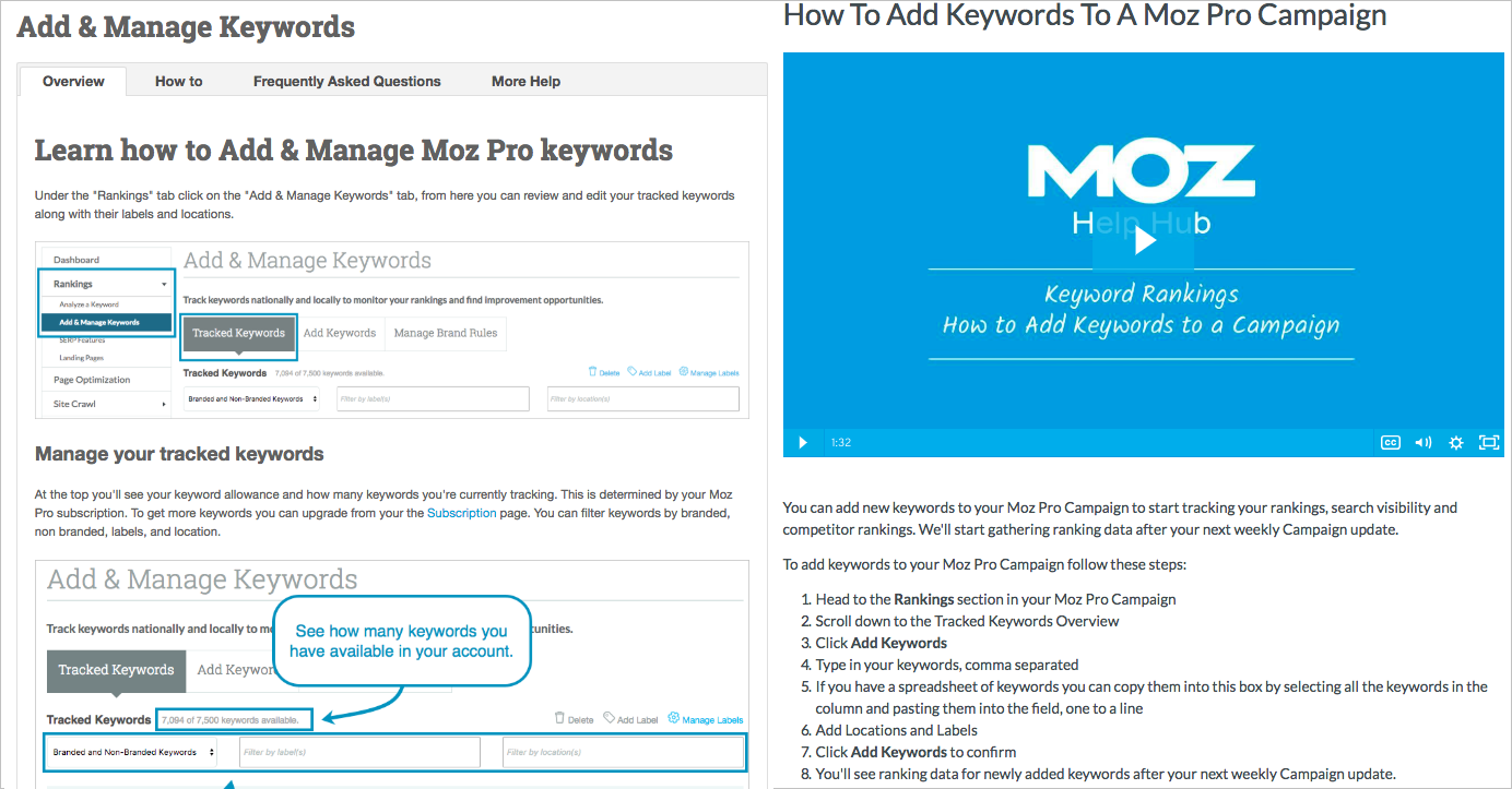 Here is an example from our guide on adding keywords to Moz Pro. We started with blocks of paragraphed content interspersed with images. After reformatting, we have a video right at the top and then a numbered list which outlines the steps.
