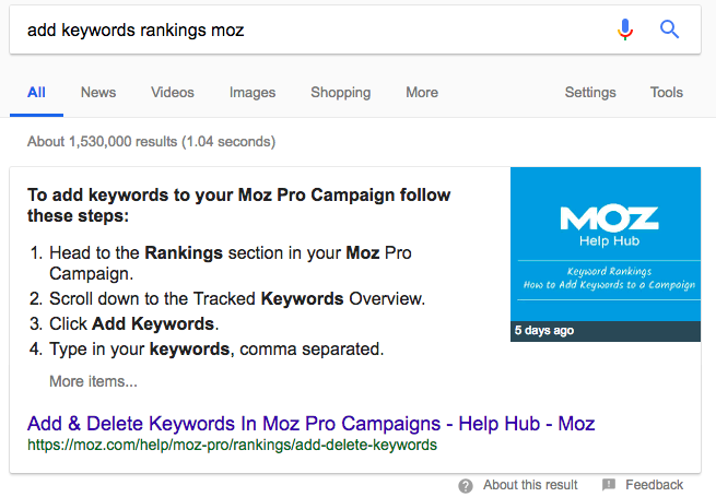 We’ve got all the things we want in a rich snippet: the first 4 steps with the "more items" link (hello, CTR!), a link to the article, and a screenshot of the video. On one hand, the image of the video looks kind of strange, but it also clearly labels it as a Moz guide, which could prove to be rather tempting for people clicking through from the results. We’ll watch how this performs over time to figure out if we can improve on it in future.