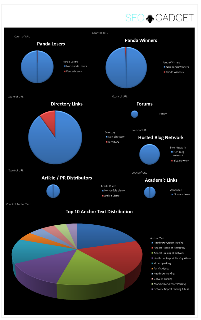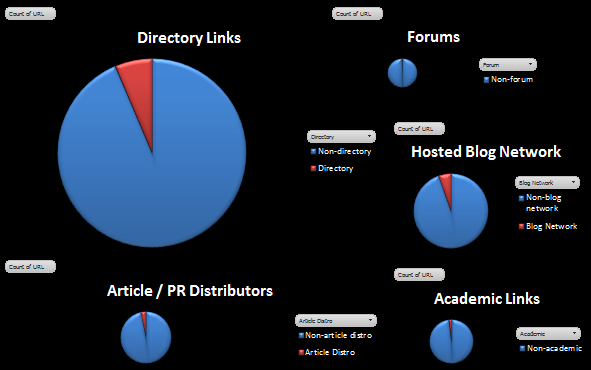I grouped the pie charts for Directory Links, Forums, Article/PR distribution, Academic and Hosted Blog Networks together.